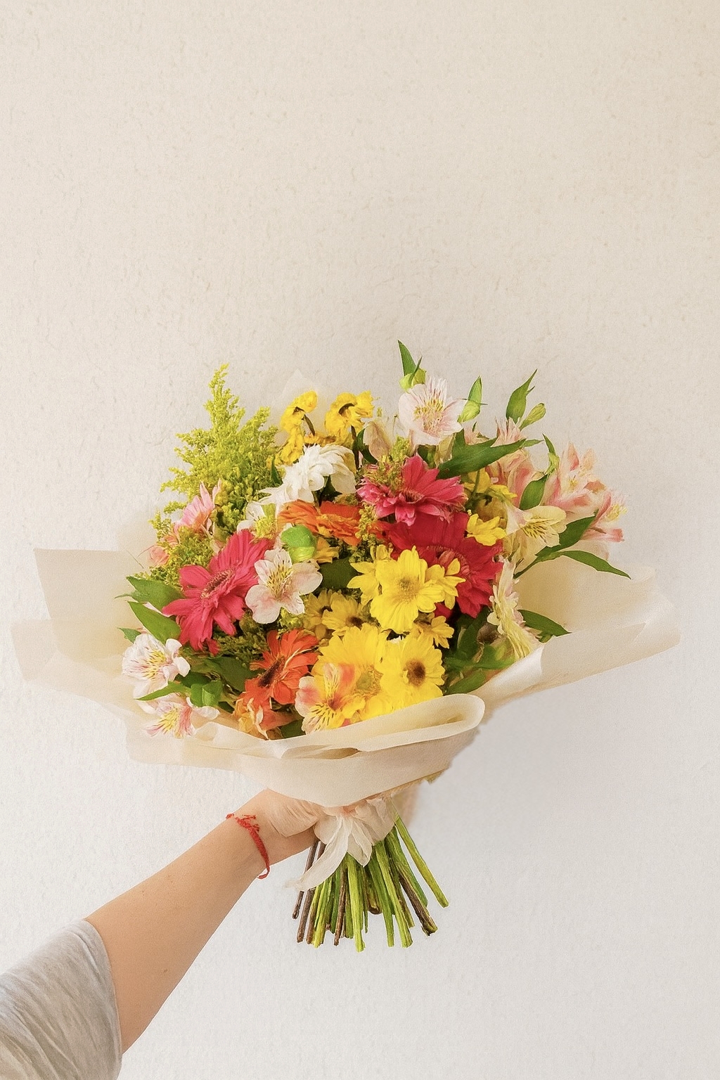 Ramo surtido con Margaritas, Lilium, Gerberas y Rosas Rojas
